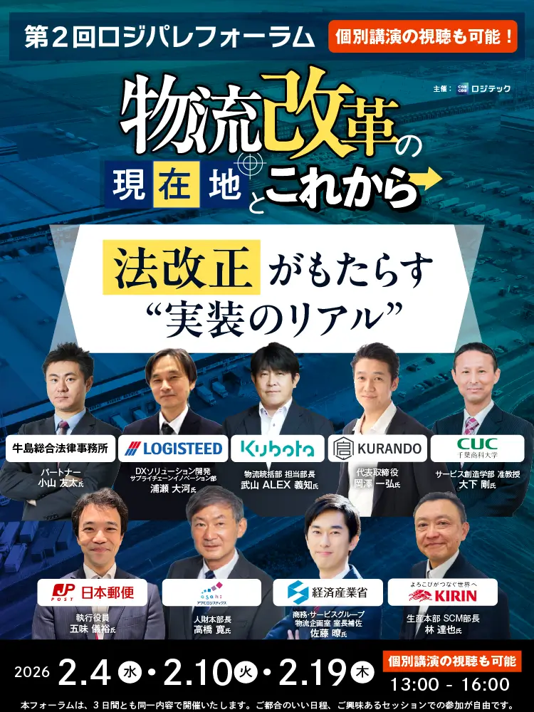本フォーラムでは、政策・法制度・研究・荷主・物流事業者といった多様な立場の登壇者が一堂に会し、法改正の背景や狙い、各社の現場で顕在化している課題と取り組み、そして今後数年を見据えた実務上のポイントについて議論します。